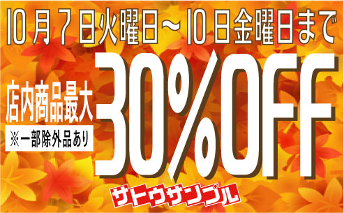 飲食店向け食品サンプル専門店サトウサンプルでは、10月7日火曜~10日金曜日まで店内商品最大30 %引きのセールを行います。この機会にお買い換えを検討してみてはいかがでしょうか。※一部除外品あり
